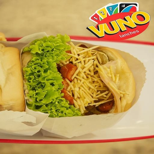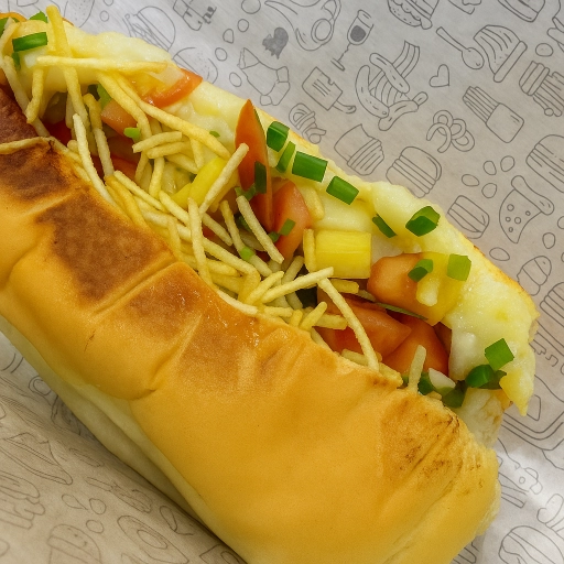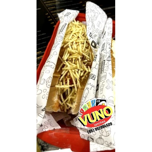 Pão, 2 salsichas, queijo, molho e batata palha.