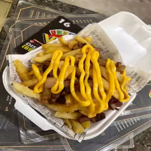 Pão, 2 salsicha, molho, bacon, calabresa, purê, queijo e requeijão cremoso.