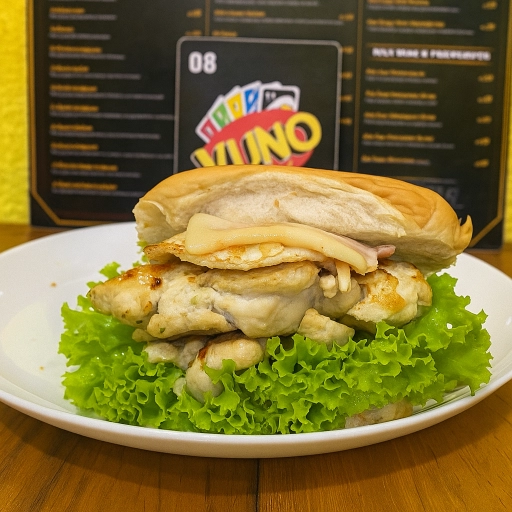 Pão, queijo, presunto, file de frango, ovo, milho, batata palha e alface.