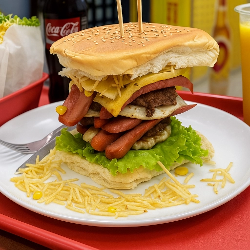 Pão, queljo, presunto, carne, salsicha, banana, bacon, ovo, milho, batata palha e alface.